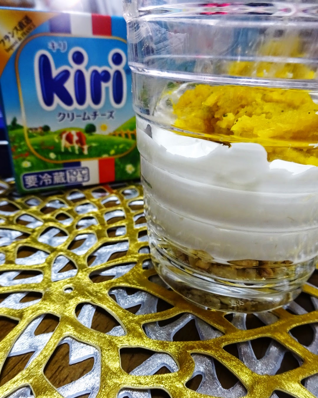 - 透明なグラスに、下から1のナッツ、3のクリームチーズクリーム、4のかぼちゃペーストの順に盛り付けます。よく混ぜて頂きます。