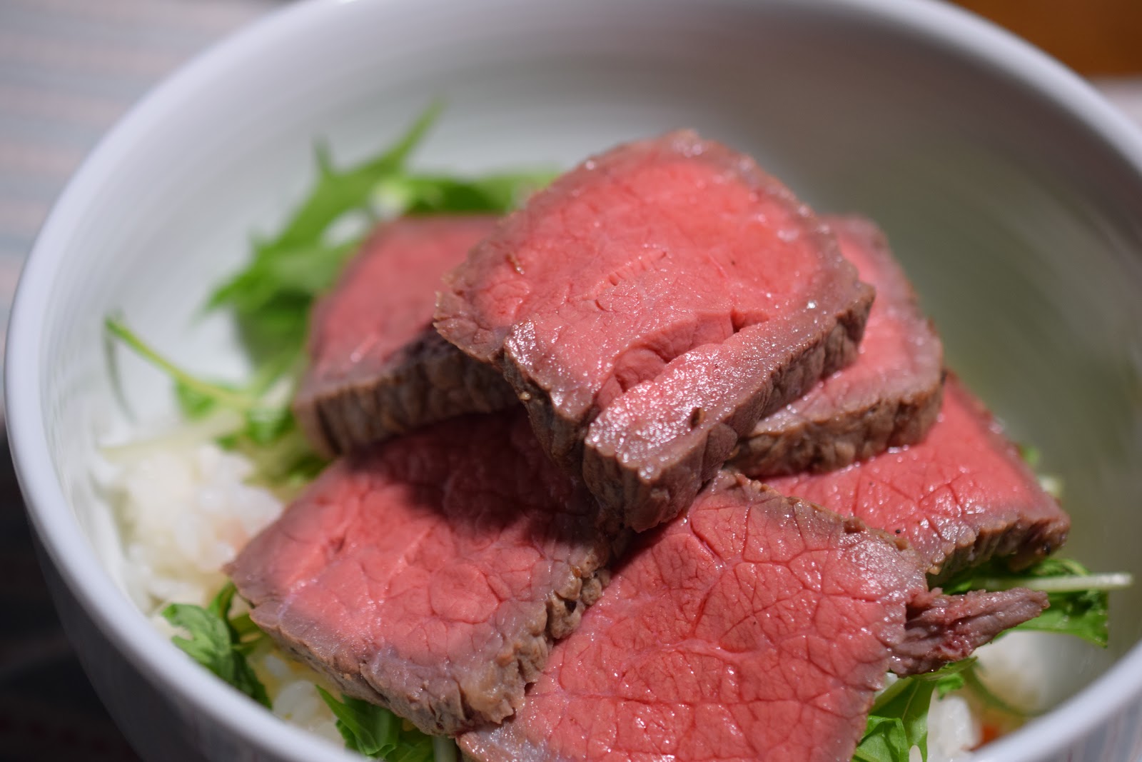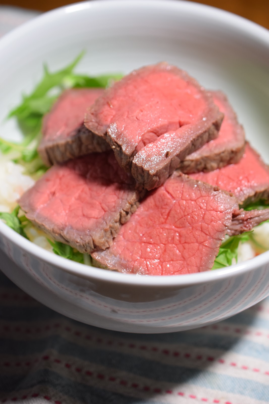 今回は炊飯器で真空低温調理したローストビーフを野菜入り酢飯にのせていただきます。