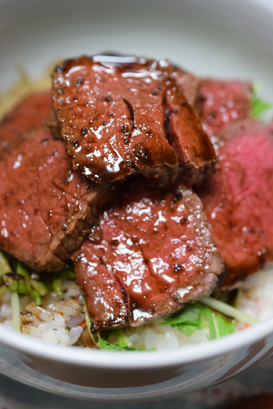 - 酢飯の上に食べやすく切った水菜をのせ、切り分けたローストビーフ、8のソースをかけて完成です。