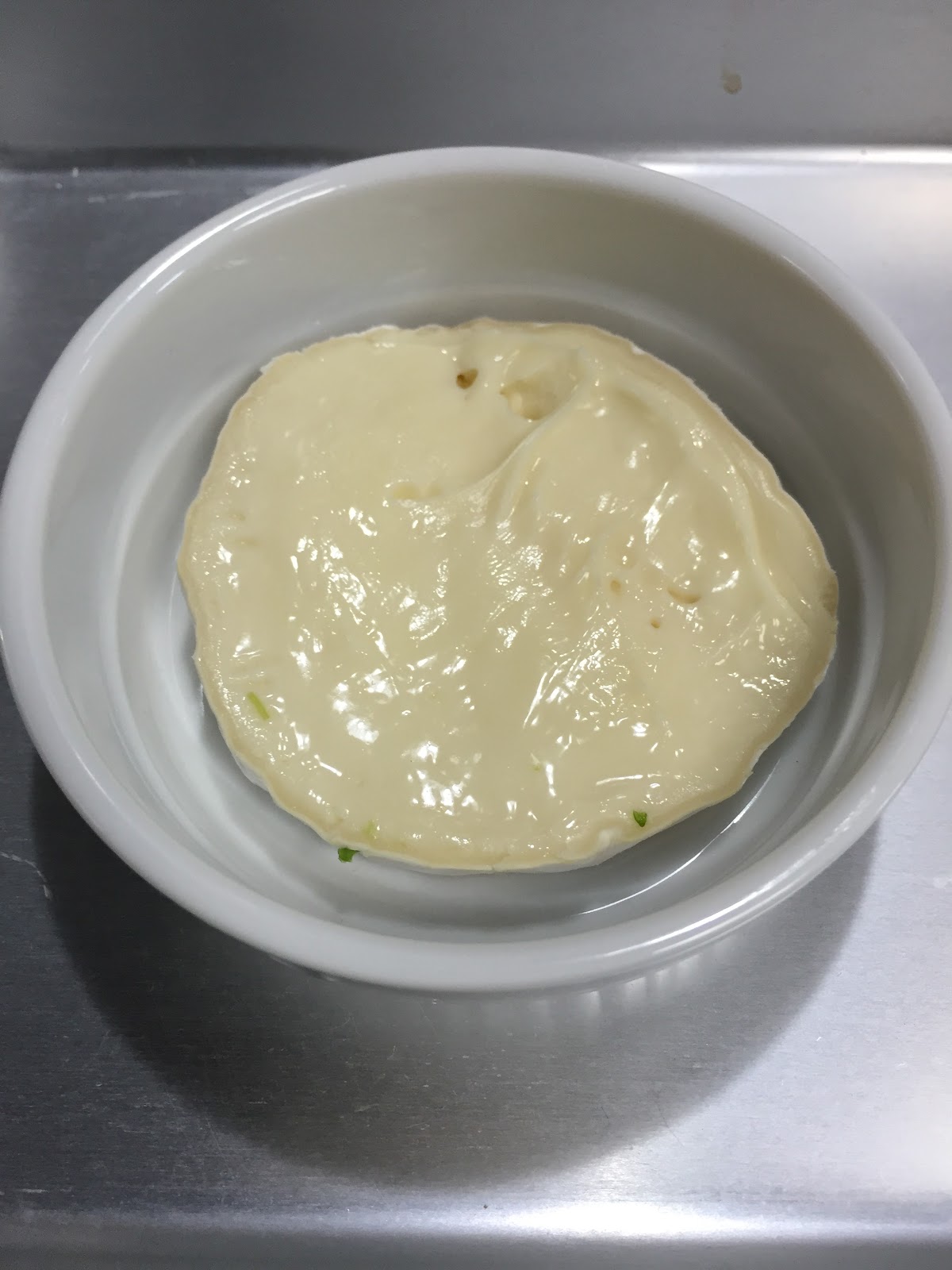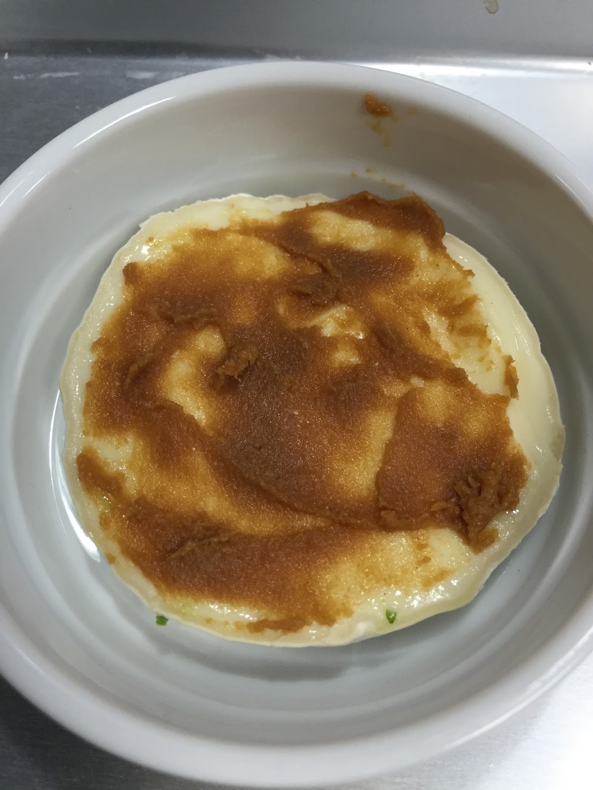 - カマンベールチーズをココット皿に入れ、断面にまんべんなく味噌を塗ります。
