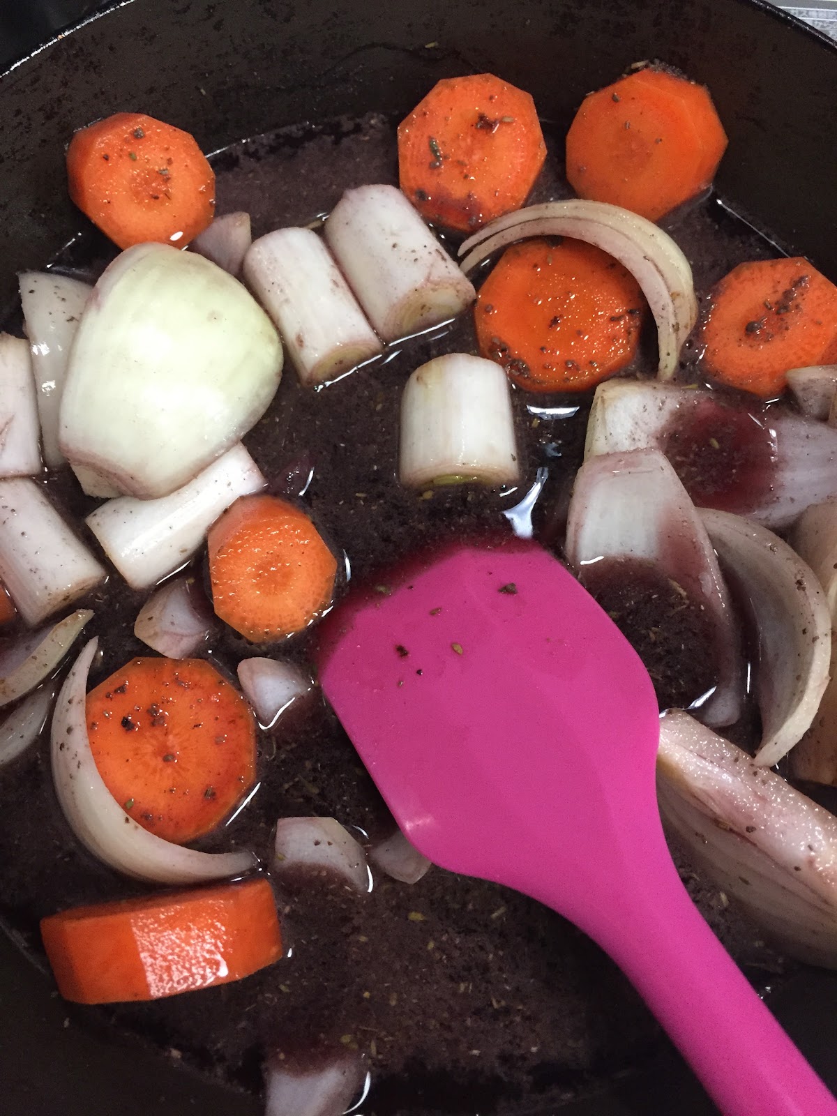 | ワインを入れたらうまみをこそげ落とします。 スパチュラはあると便利です! |