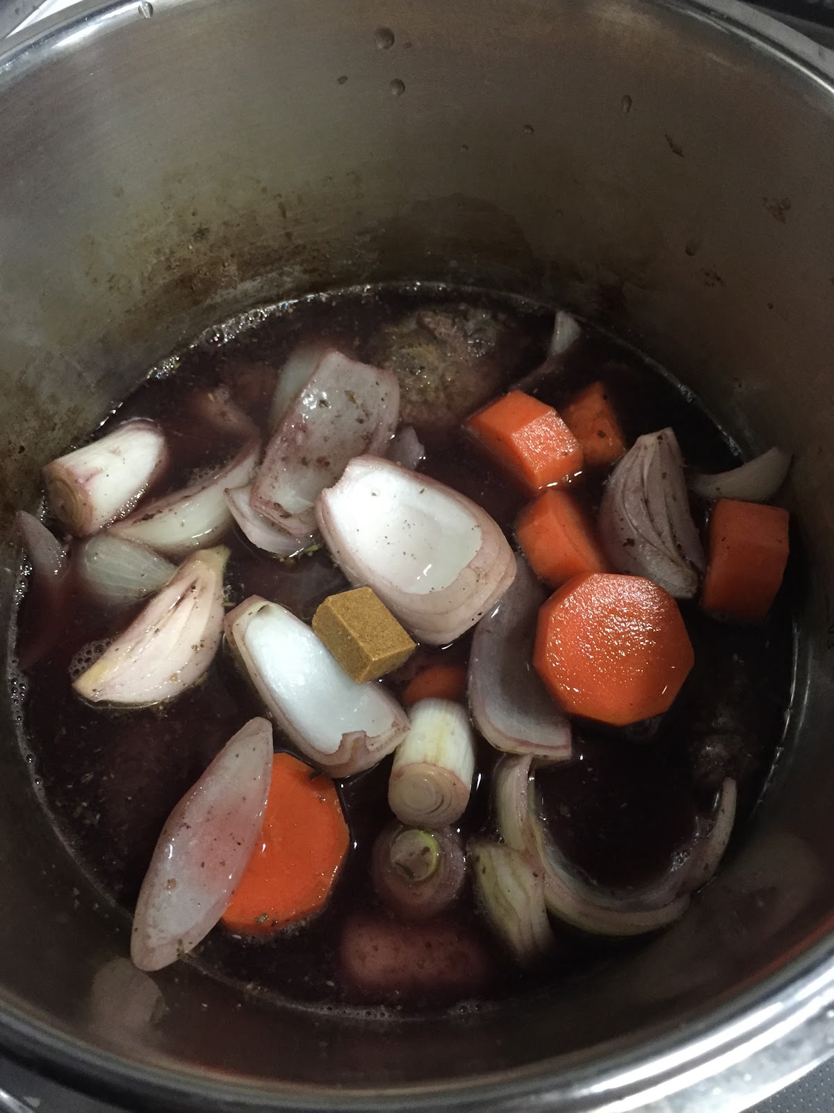 先日のボジョレー解禁に合わせて、圧力鍋で牛すね肉のワイン煮込みを作りました。